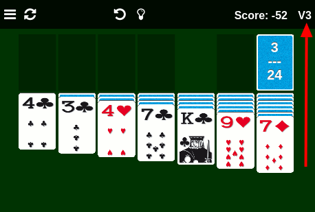 When you click the Stock pile, a card (or three cards) is/are opened to the left in a pile called “Waste”. There are two indicators on the Stock pile: x/x. The top one lists the available number of cycles of the Stock pile. The value is infinite for the Klondike version. However, there is a limit in Vegas mode. In Vegas Draw 1 mode (V1) you can cycle through the Stock pile just once. In Vegas Draw 3 (V3), the Stock pile can be cycled three times.